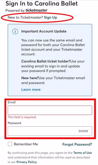 ON YOUR PHONE, sign into your Carolina Ballet Account Manager with your Ticketmaster account email and password.
